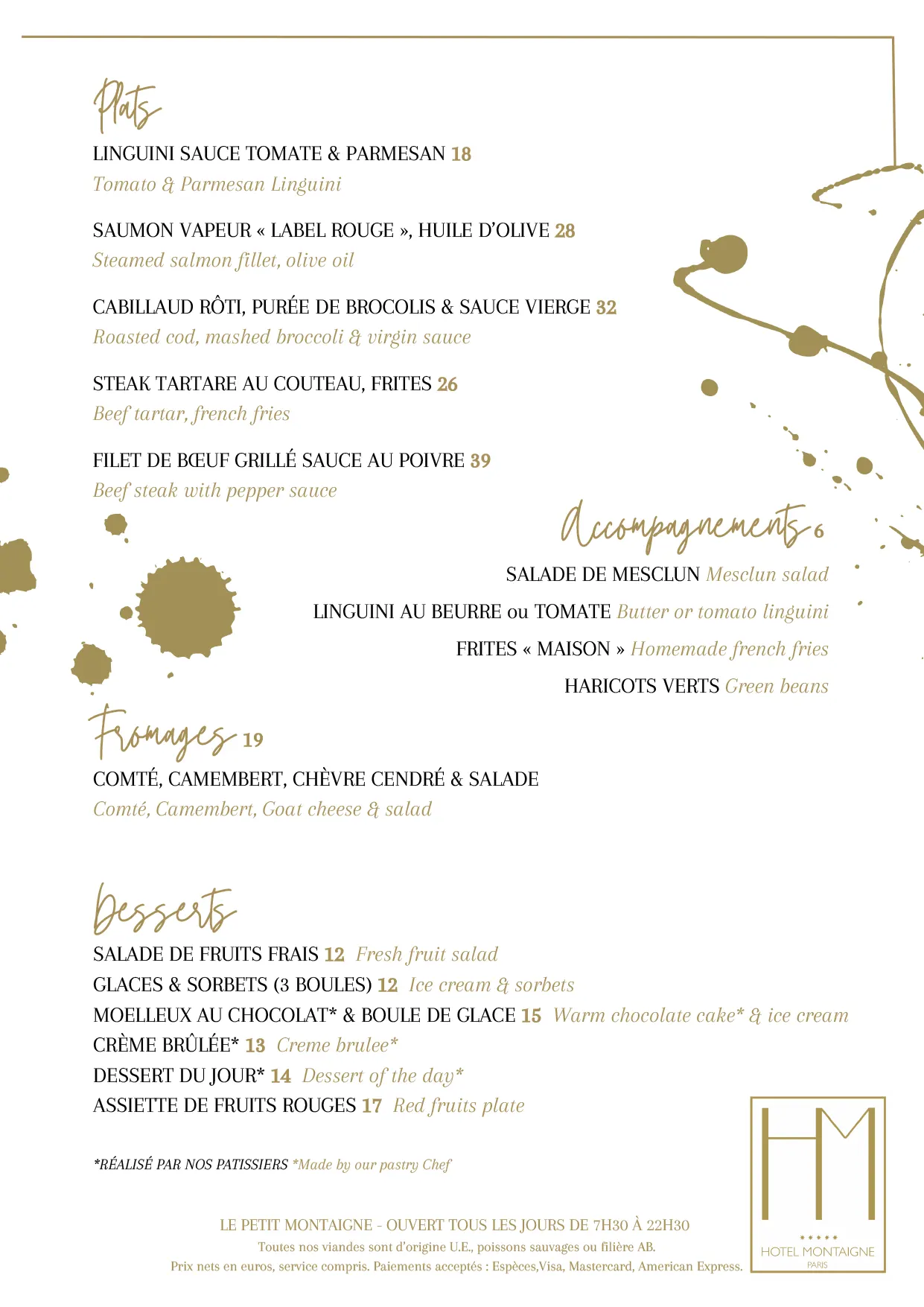 El Bar-Restaurante del Hotel Montaigne quiere ser un lugar de moda y caluroso. La decoración, la elección de los muebles, las telas, todo está para crear una atmósfera intimista. Una música suave, unas notas de pianos dan entonces a nuestros anfitriones un sentimiento de encontrarse en el salón de una casa particular.
